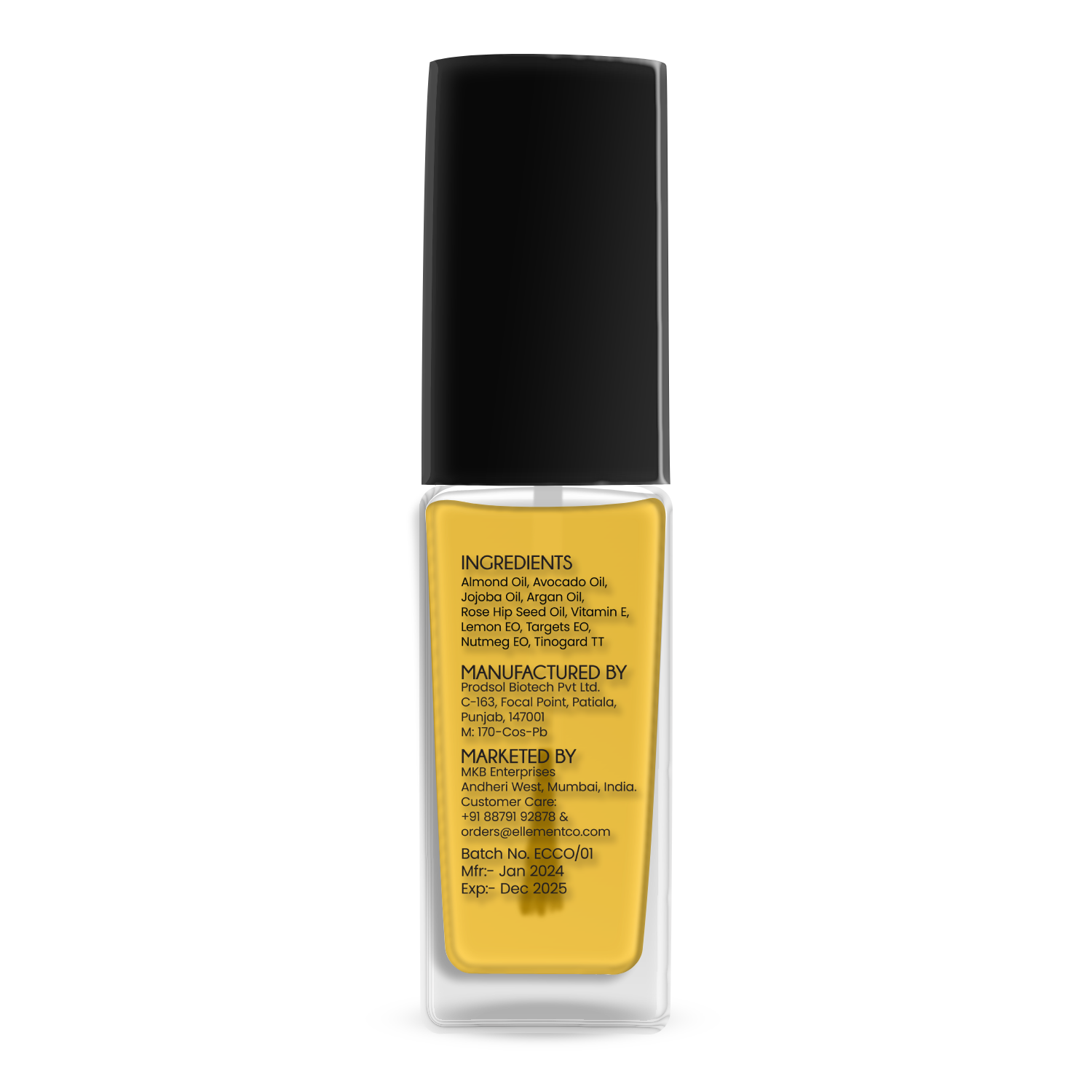 Sweet Almond, Avocado Oil, Jojoba Oil, Argan Oil, Rose Hip Seed Oil, Lemon Oil, Vitamin E Oil, Nutmeg Oil, Tagetes Oil