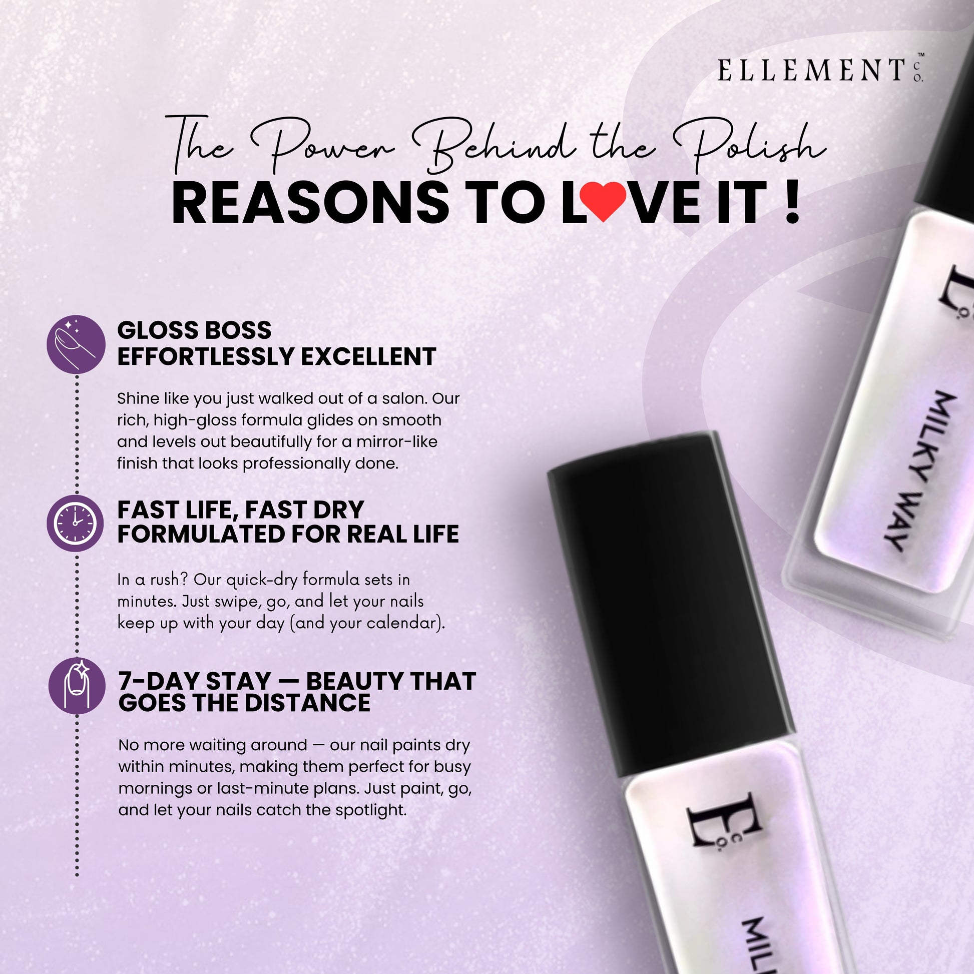 Crafted with a chip-resistant, non-yellowing, gel-like formula, Milky Way delivers intense colour payoff and a high-shine finish that lasts up to 7 days while keeping nails strong and healthy.